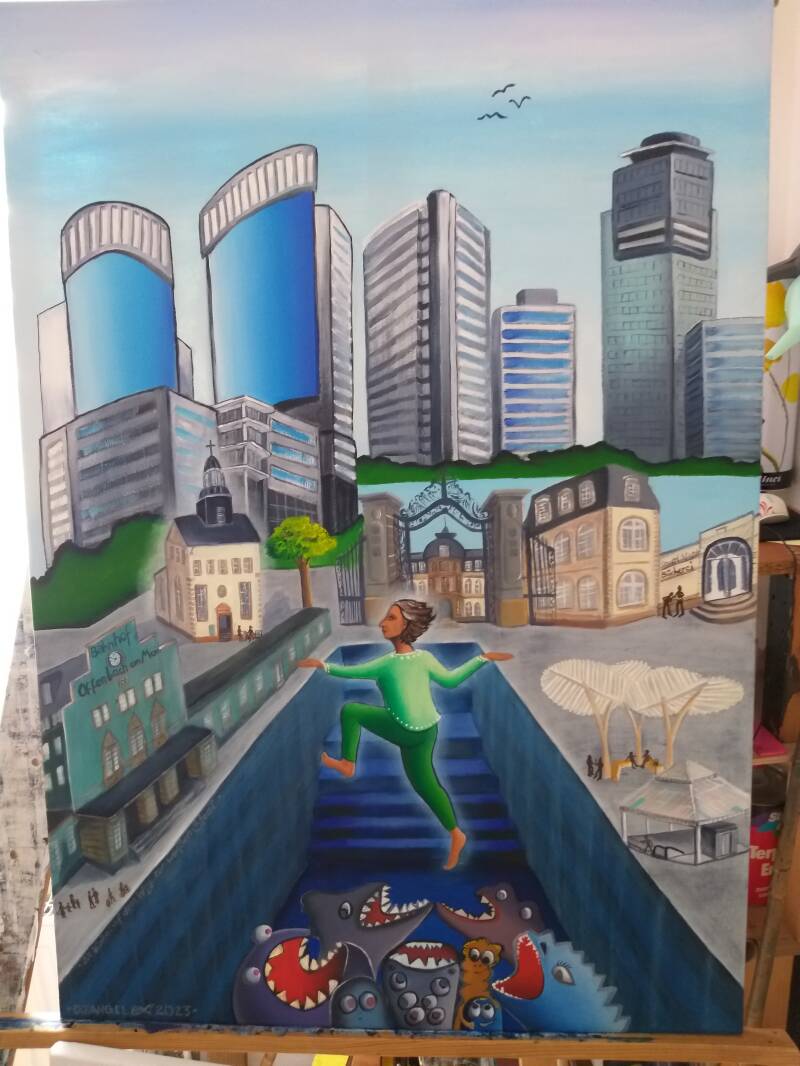 In einer schweren Zeit erschienen mir im Traum Fische, mit Nietenjacken. Es dauerte bis ich die Botschaft entschlüsseln konnte. Seitdem male ich Fische und repariere sie und sie entwickeln sich. Am Anfang hatten sie Zähne, heute sind sie freundlicher.