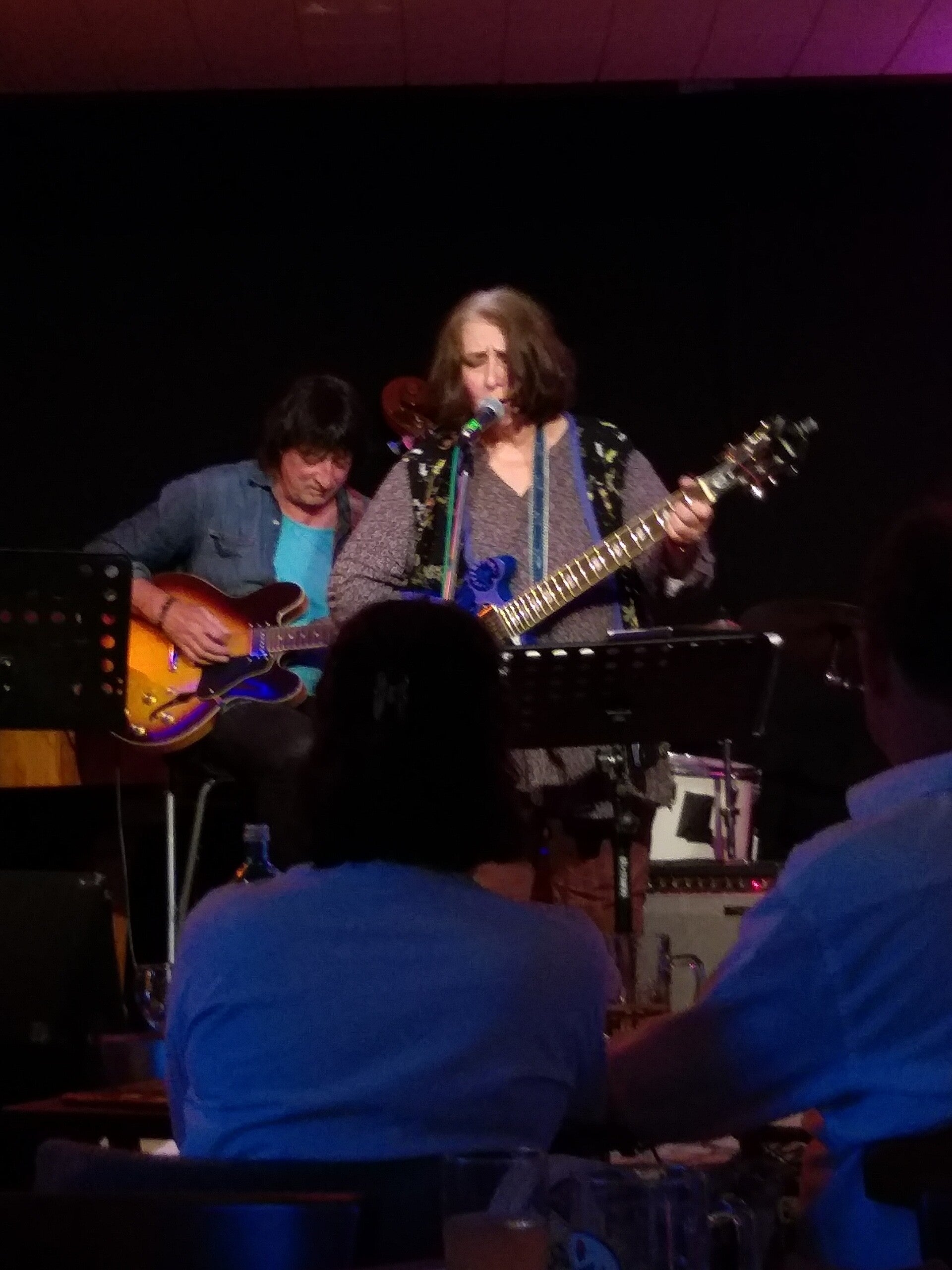 Nach vielen Jahren ohne Band fand ich den Mut, alleine mit meiner Gitarre auf die Bühne zu gehen. Es brauchte Zeit und Überwindung, aber ich besuchte regelmäßig "Open Stage"-Veranstaltungen, bis ich die Angst verlor. Schließlich empfand ich es als Befreiung, endlich meine eigenen Songs spielen zu können. Foto: Robert Klee begleitet mich.